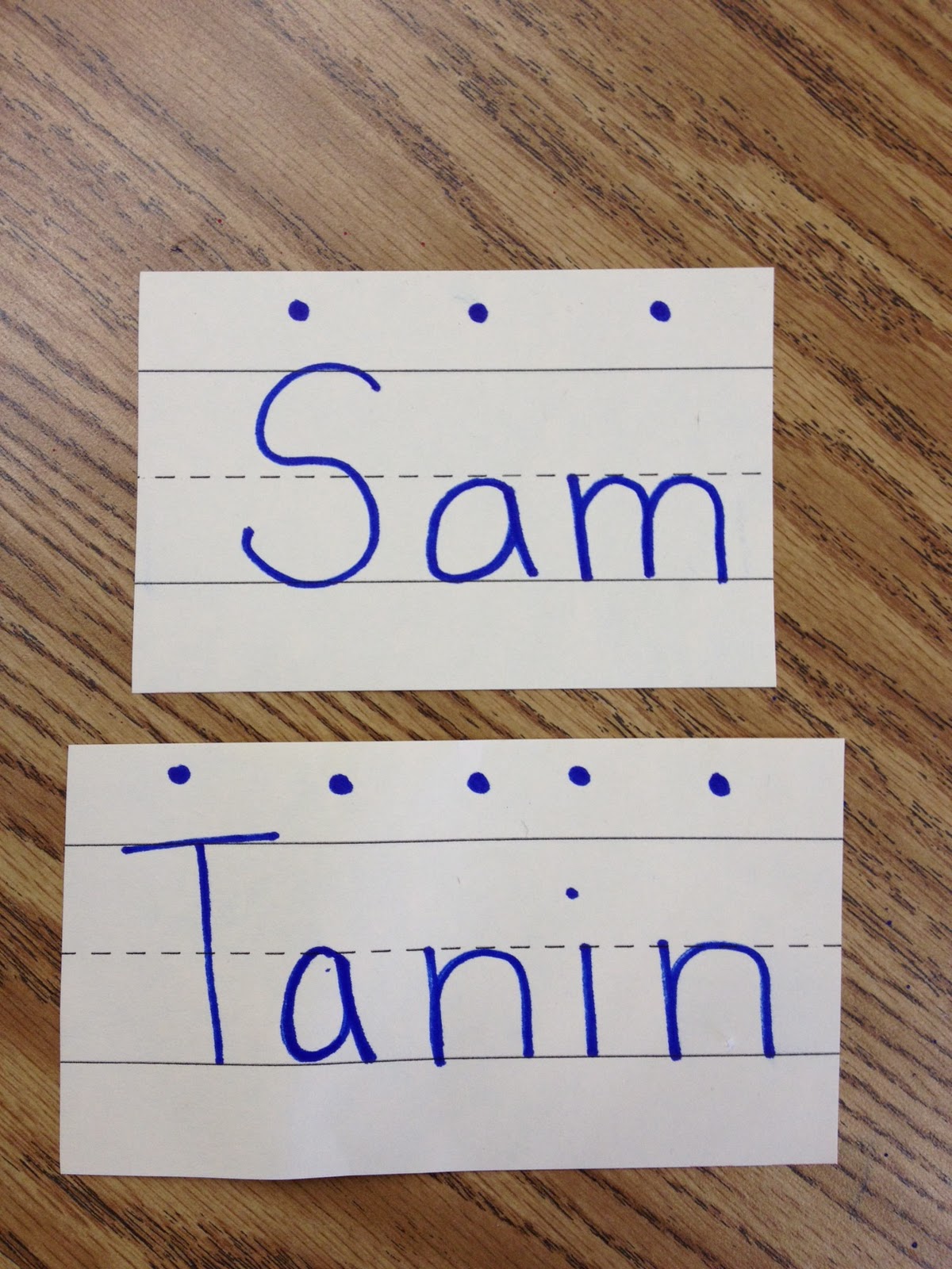 Here are two ways that I have used clothes pins. First step is to write a letter on each clothes pin. I write it on both sides so each letter is easier to find. I write each child’s name on a sentence strip and add little dots above each letter so the student knows where to place the clip. This was good to practice memorizing the letters in their own name. It is also fun for them to switch cards and spell their friend’s name.