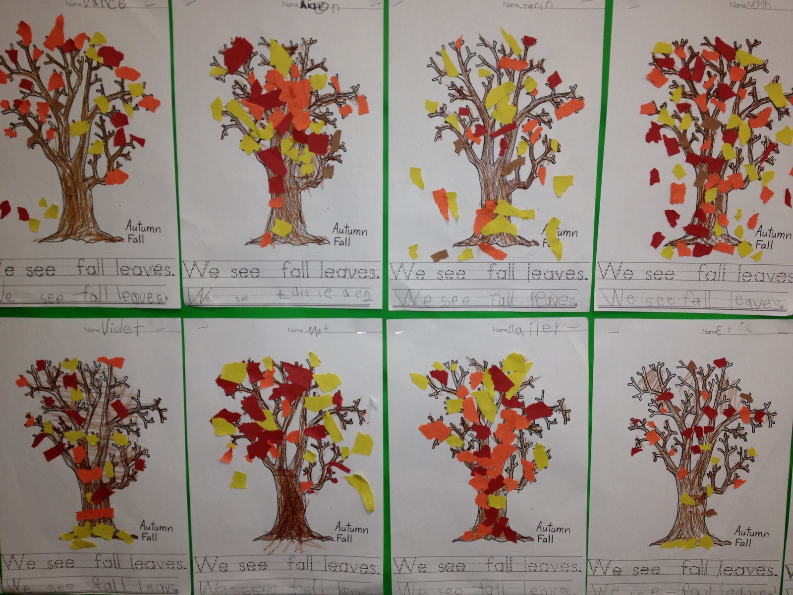 We started talking about Fall early into October. Our first exploration with seasons was making our Fall Tree. Almost every “art” project I do in the classroom, I incorporate writing with it too. This keeps us practicing our letter and sentence writing while we are also learning about Science and the changing seasons. This is a picture of the Fall Tree that we made.
