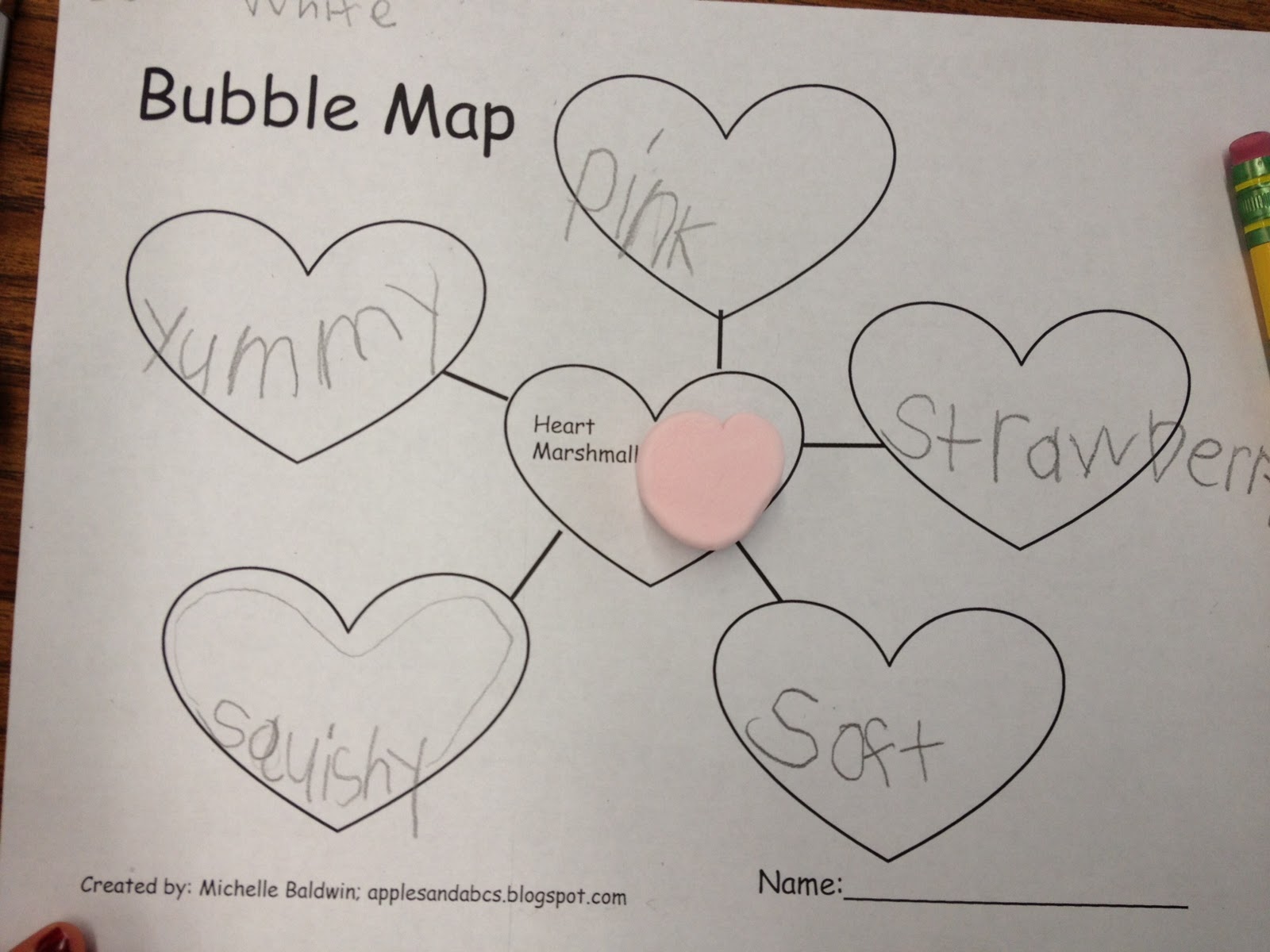 I love thinking of different ways of how to help the children understand “describing words.” I found some yummy, pink, heart marshmallows and I thought they would be the perfect item to explore and describe. We even talked about our five senses that we could use to observe the marshmallow. I started by making a “bubble map” made out of hearts to describe the marshmallow. I passed out one marshmallow to each child and we shared what we noticed about them.