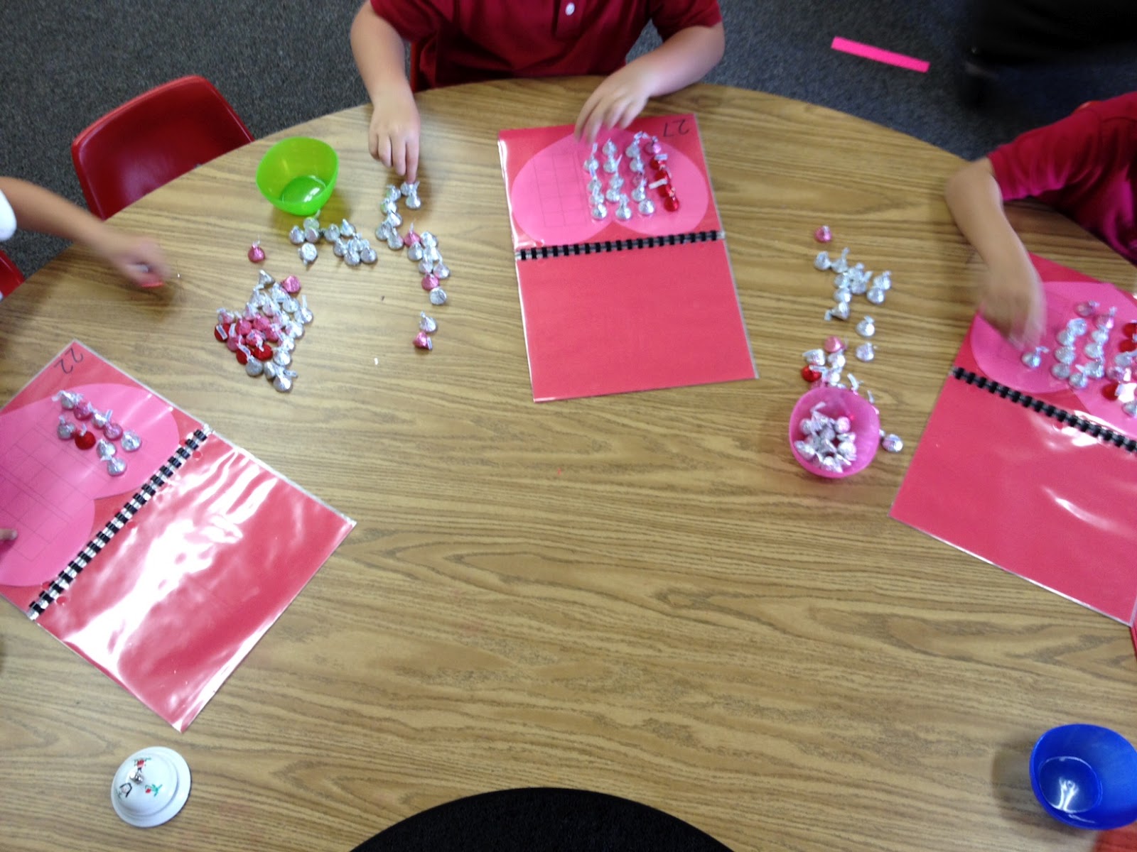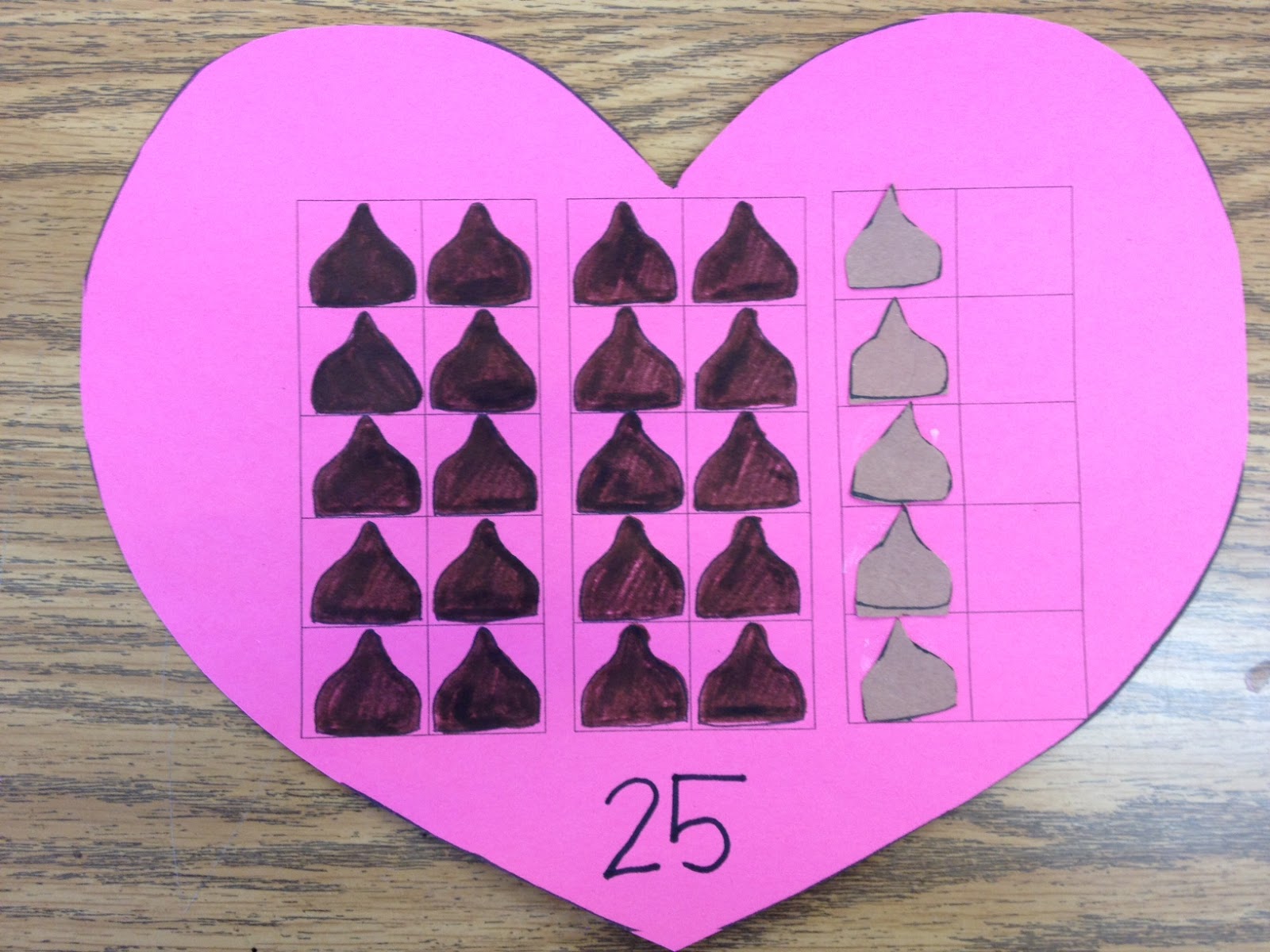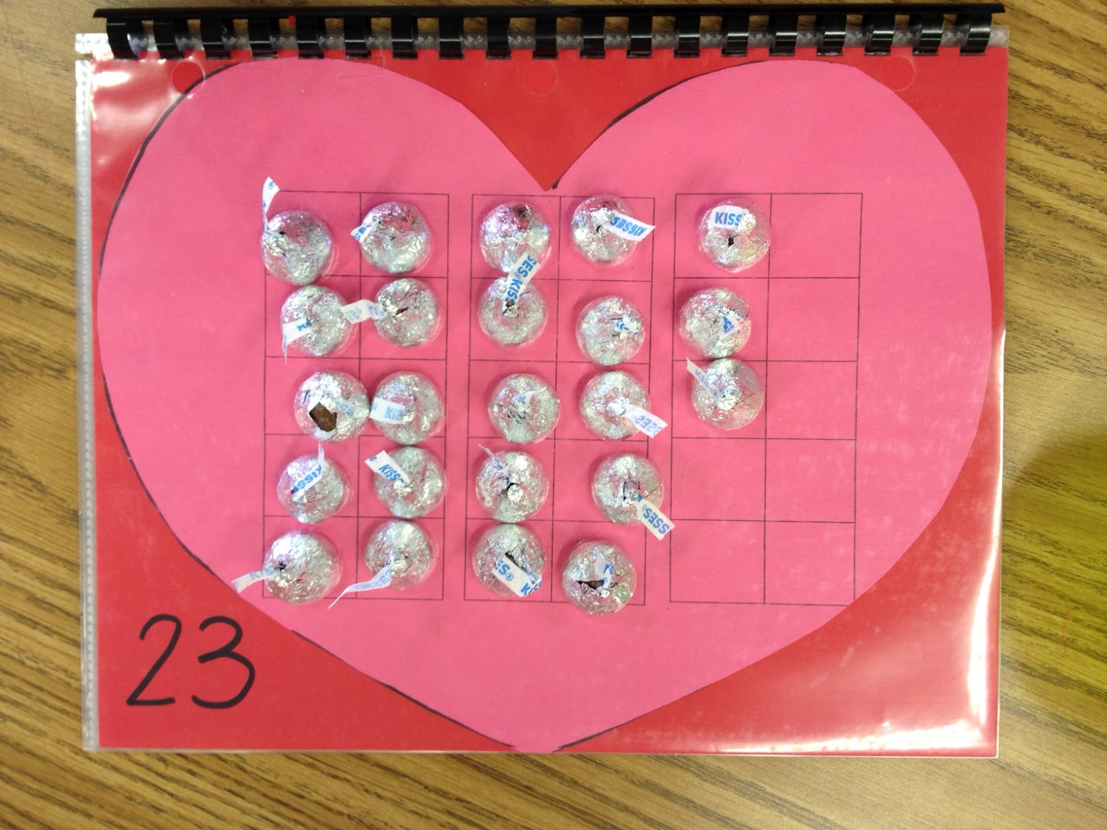 After we worked with the manipulative, we used this same concept to make a craft. I made each student a mat with 20 kisses already on the paper, and they had to color them in to make them look like kisses.