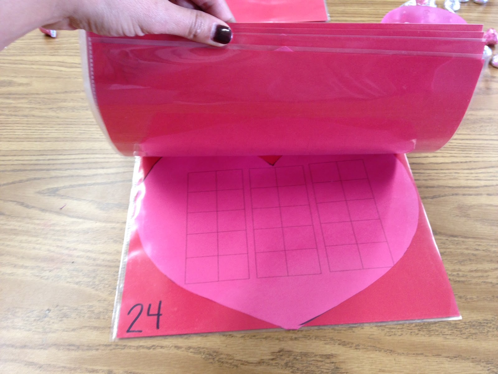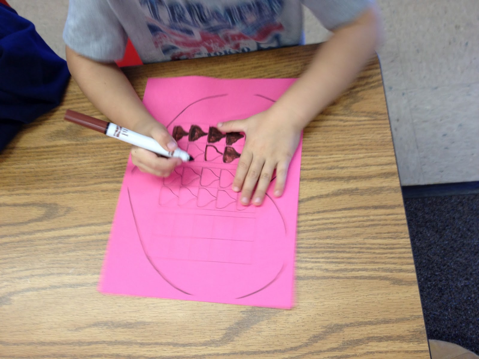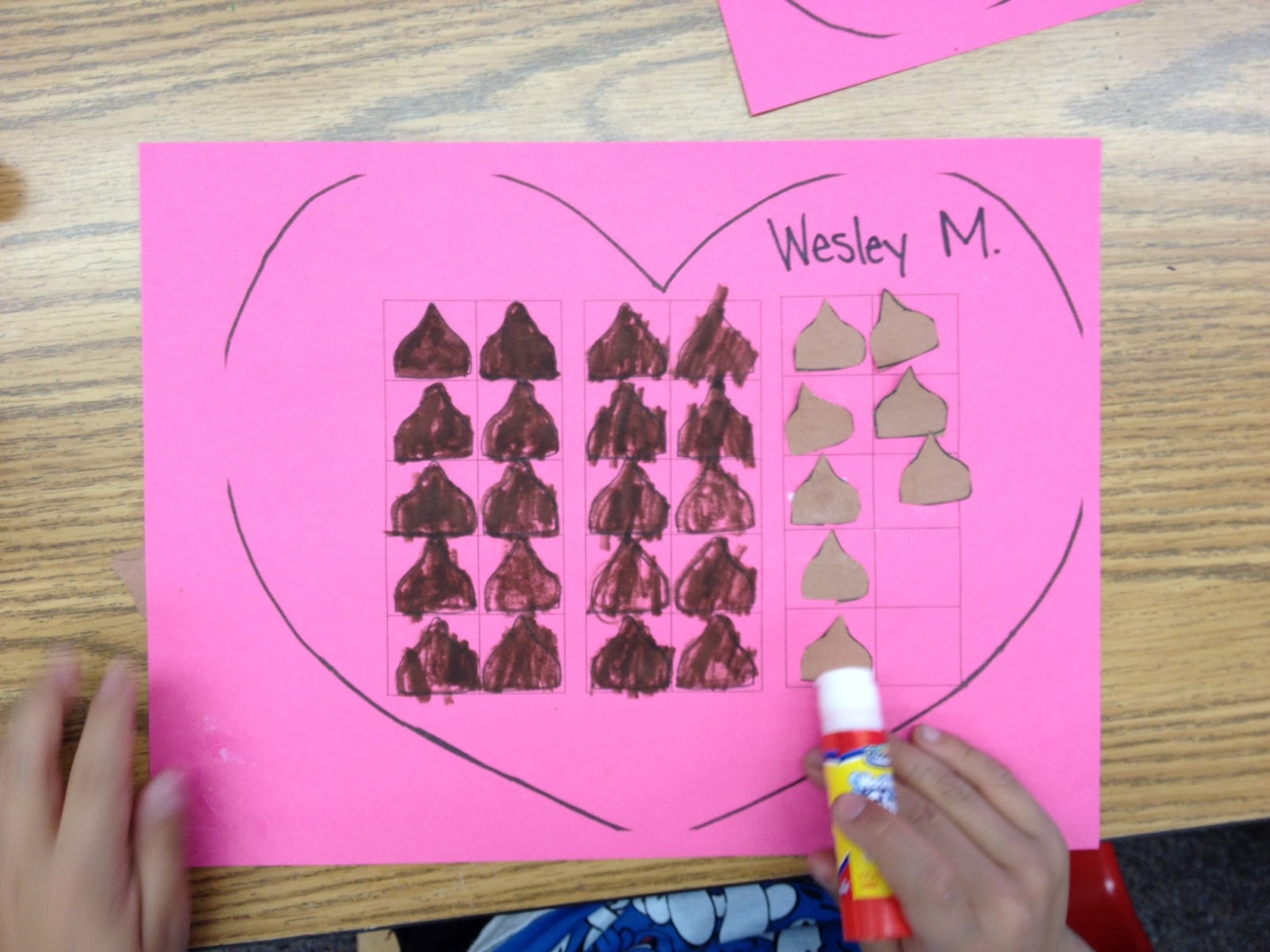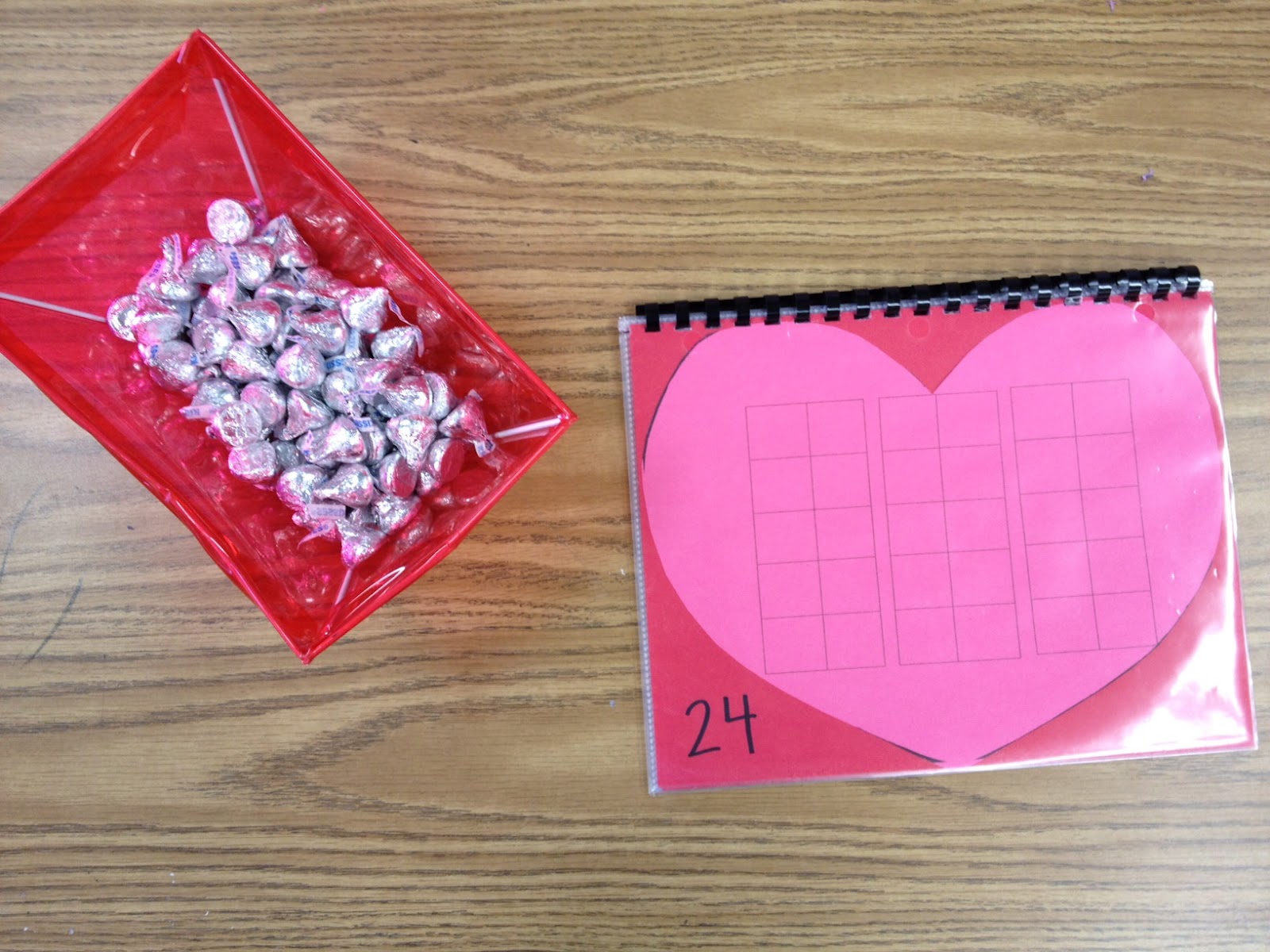 After we worked with the manipulative, we used this same concept to make a craft. I made each student a mat with 20 kisses already on the paper, and they had to color them in to make them look like kisses.