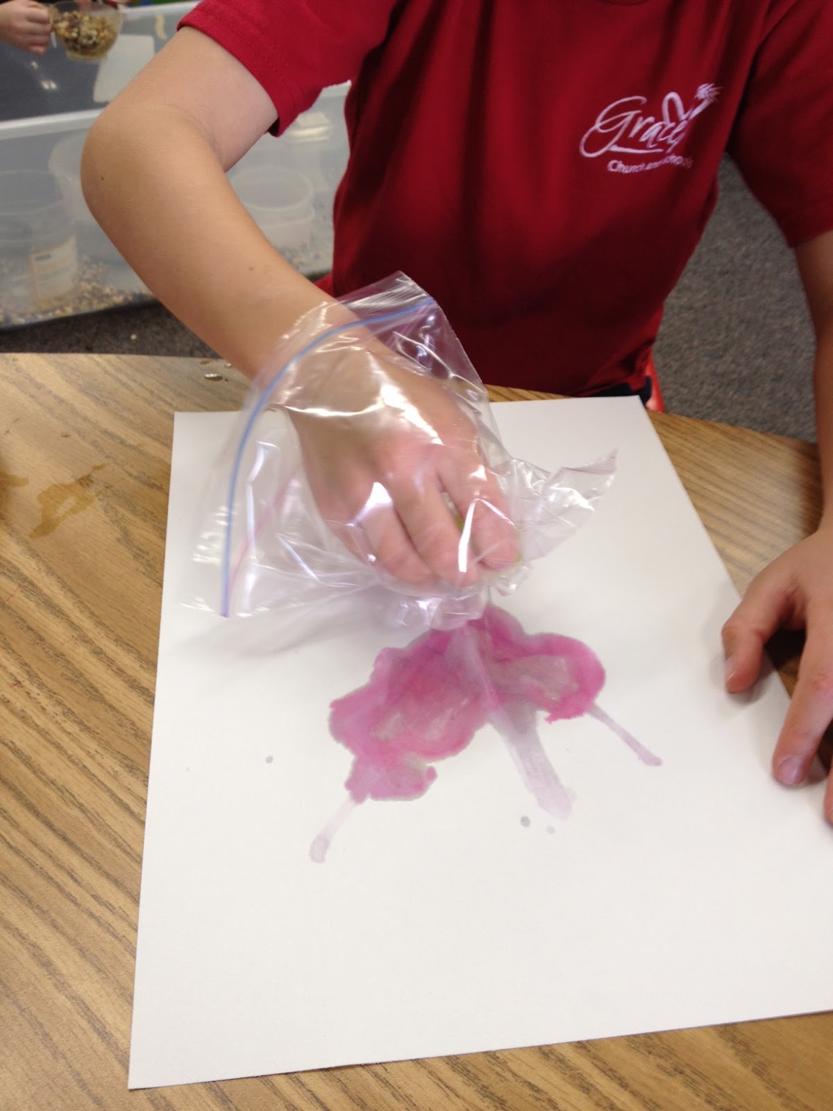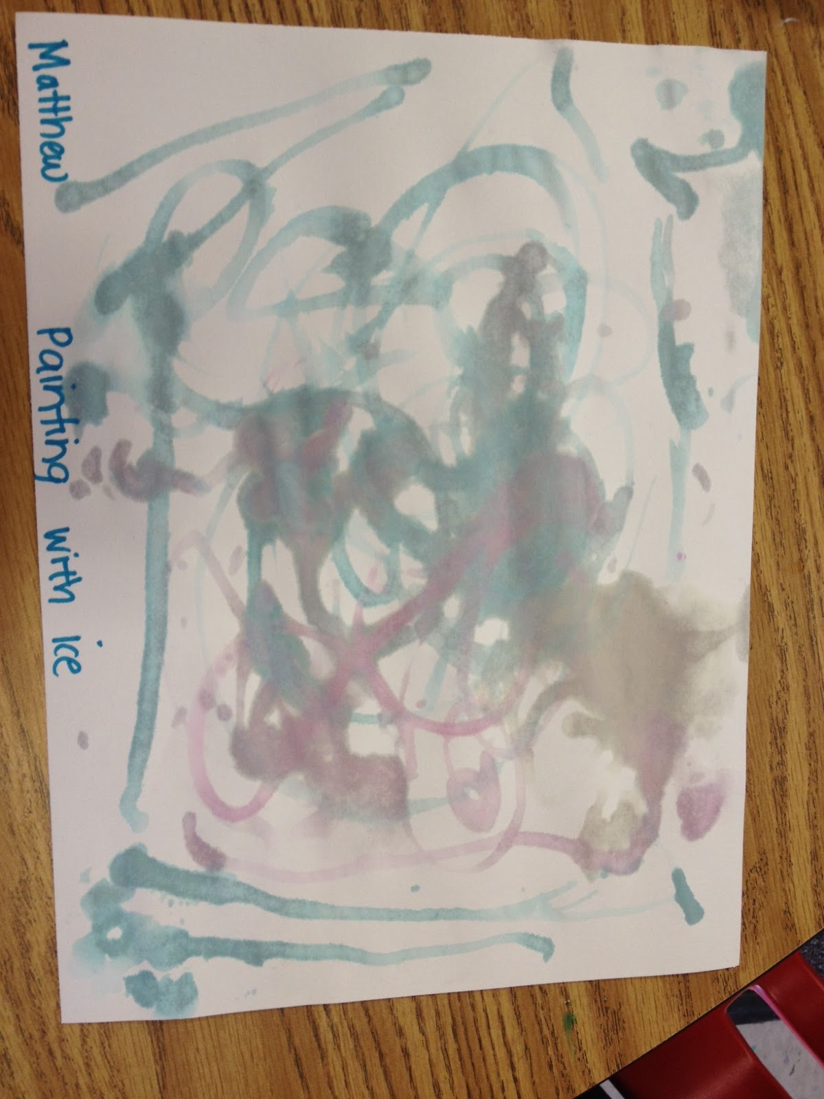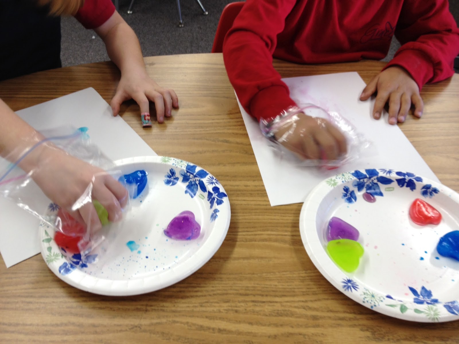 The second activity, was drawing with the ice. As the ice started to melt, the food coloring would show on the paper. I had never done this activity before and the actual drawings were not that bright, but the students liked painting with the cold ice cubes. I also didn’t think about how the food coloring would dye their fingers, so last minute I decided to have them use plastic baggies as gloves to protect their little hands. It worked well!