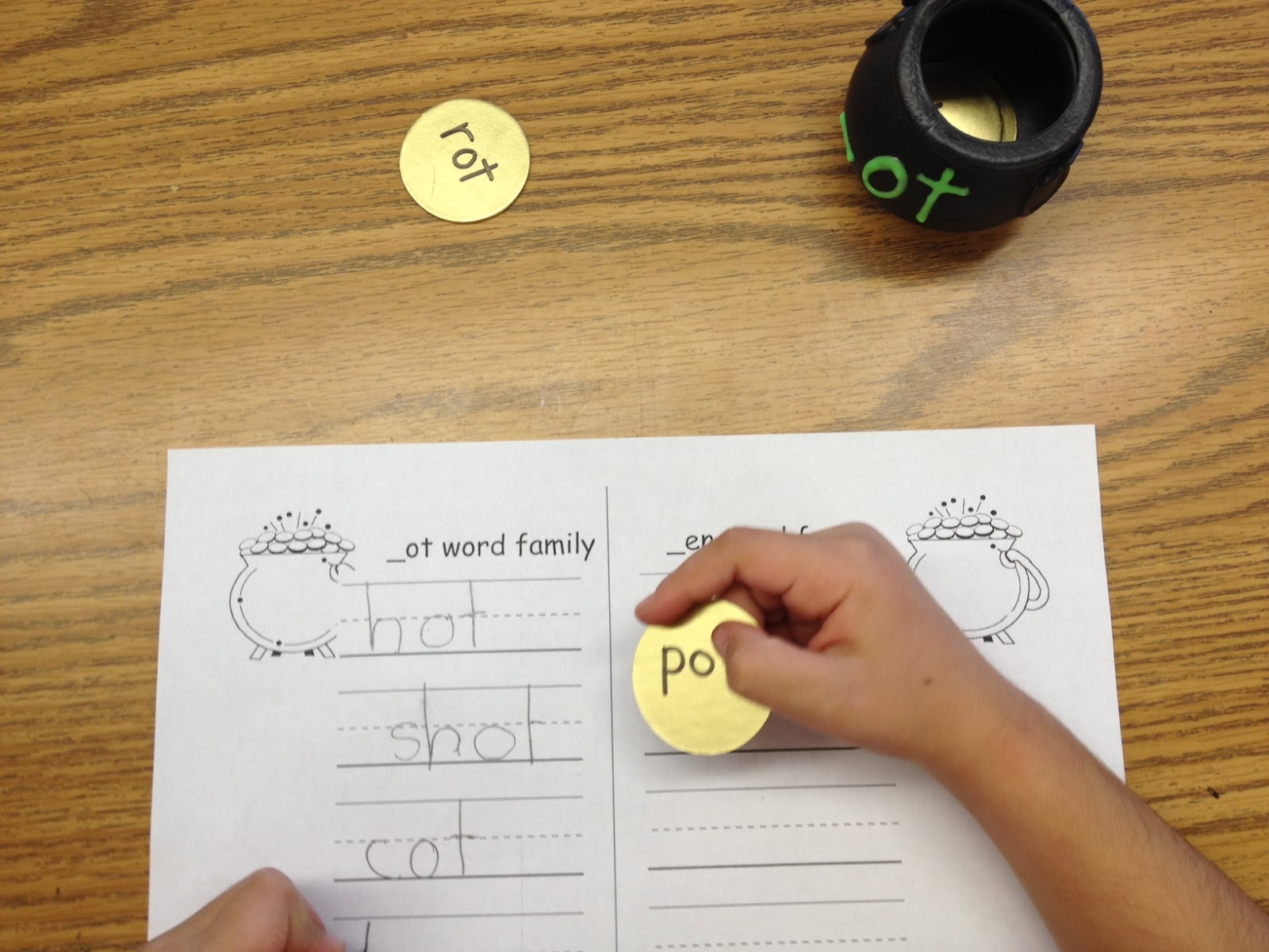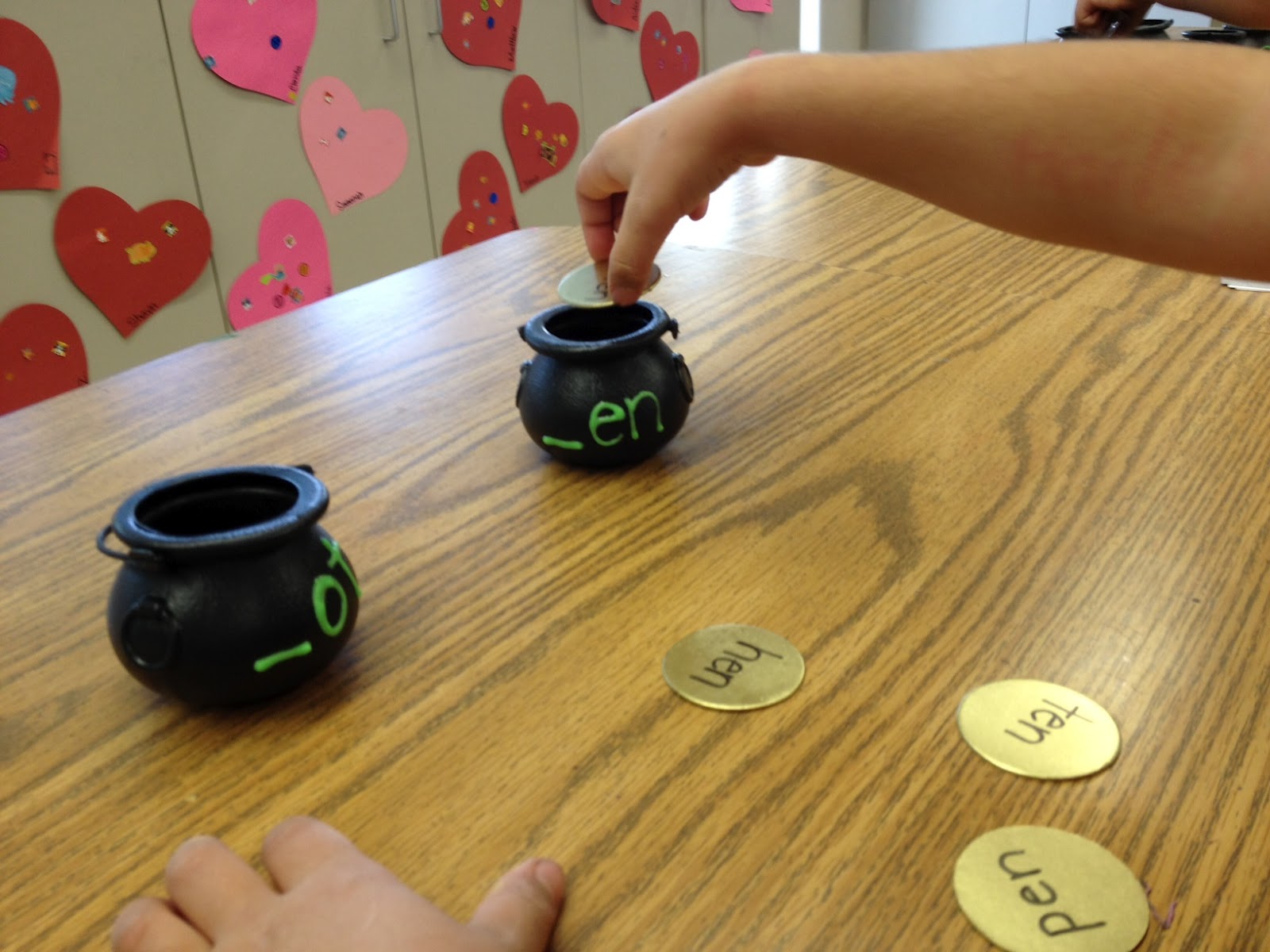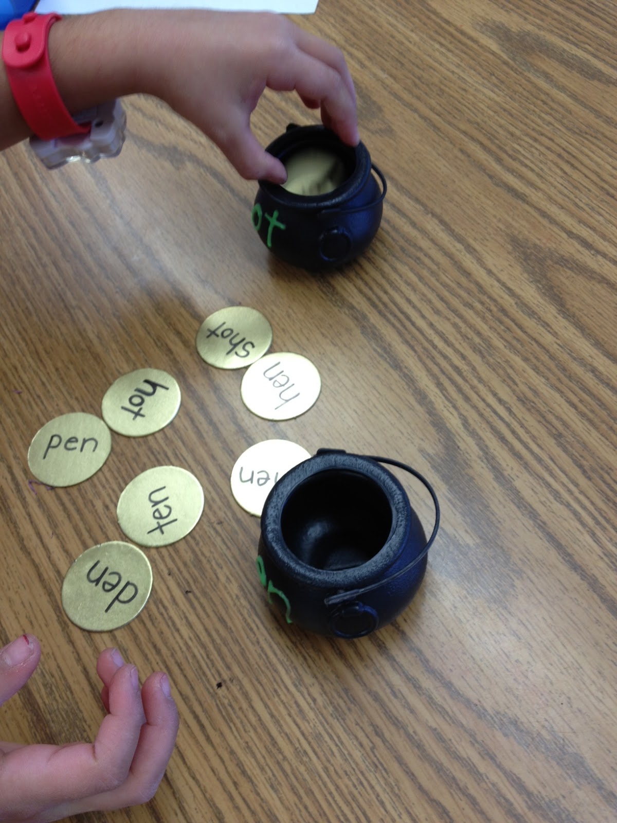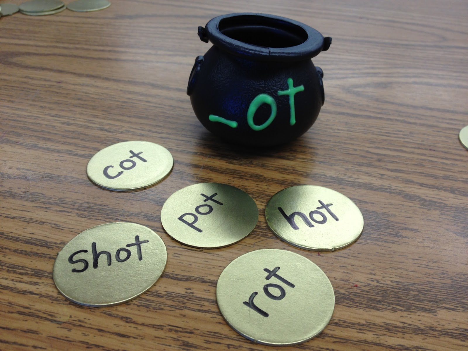 I got SO EXCITED when I saw these little black pots that I could use in a word family manipulative. I found them at Party City, and I decided to use green puffy paint to write the different word families on them. Then I spray painted pogs (anyone remember those???) gold, and then made this pots of gold game!