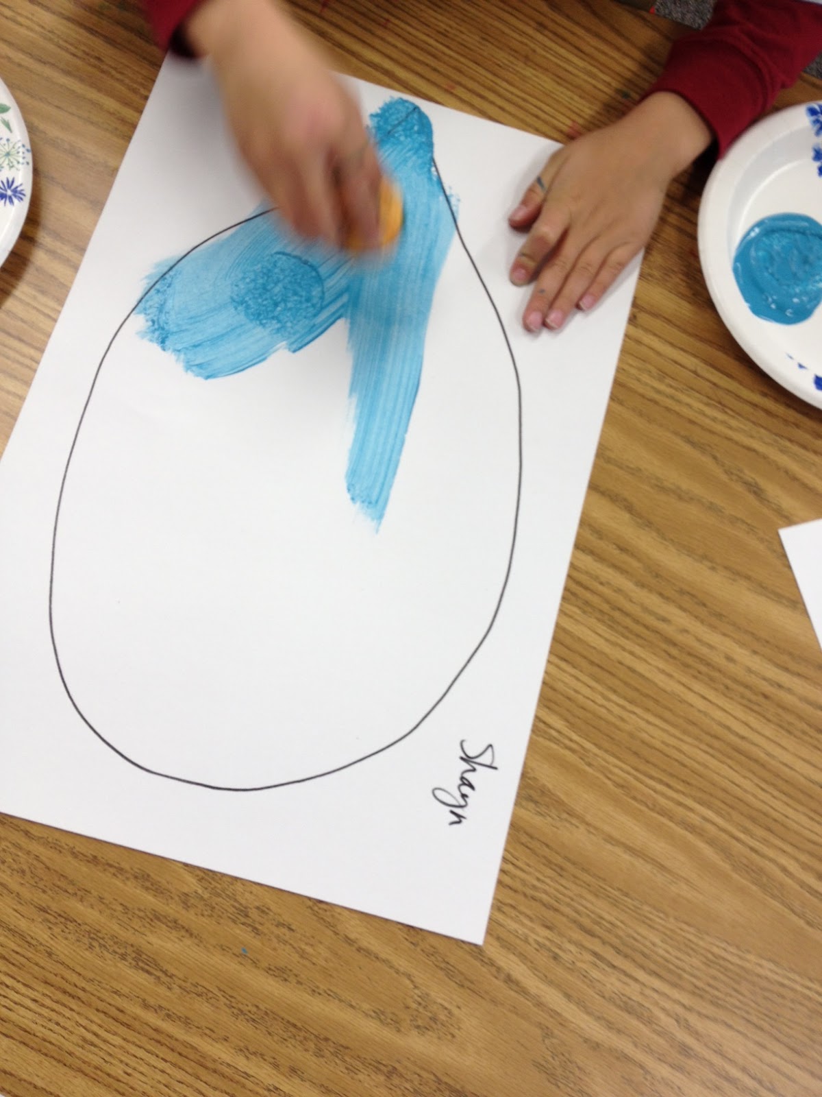 I had each student sponge paint a raindrop. I had them dip the sponge in the paint and they “pushed” the paint around instead of the “sponging” technique. I didn’t want there to be tons of paint on the raindrop, so I had them slide the sponge around and use as little paint as possible.
