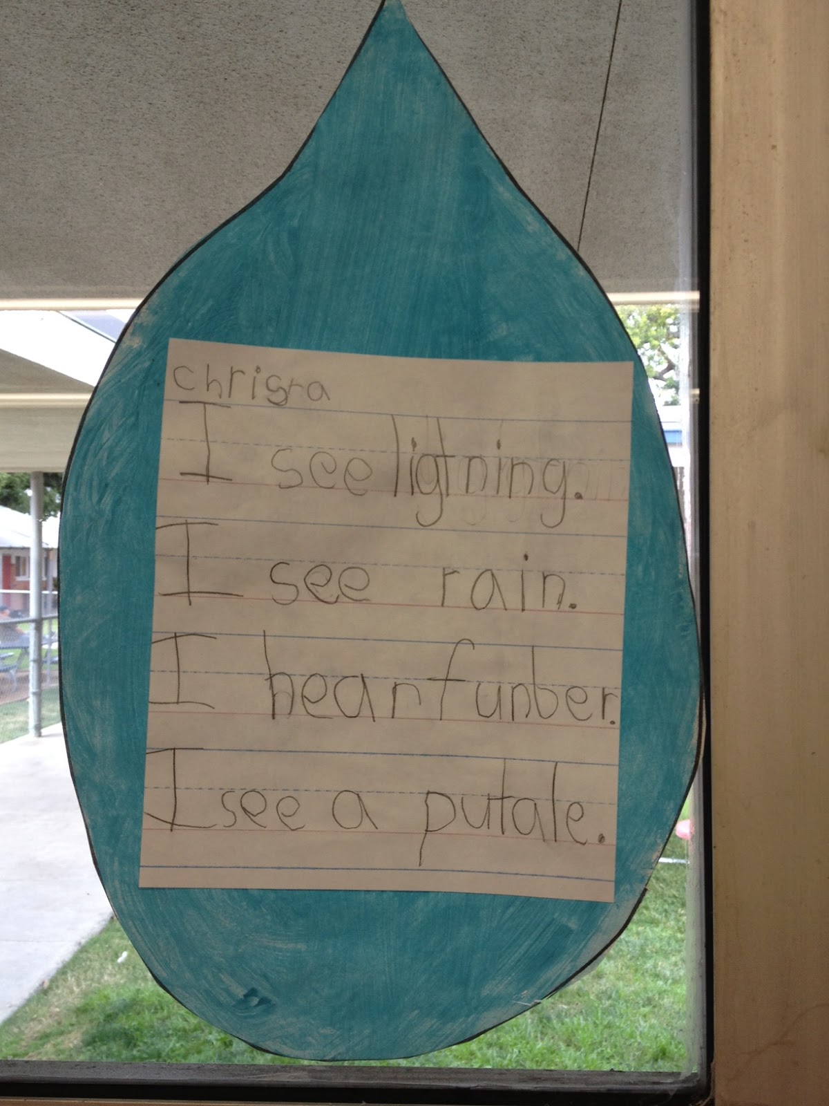 At this point in the year, I model about four sentences on the board, using ideas they give me, and then I erase them. Since we are learning about rain, I wrote that word on the board for them. They had to write their sentences independently, writing down the sounds they hear in the words that they are trying to spell. It went really well, and I am so proud of them!