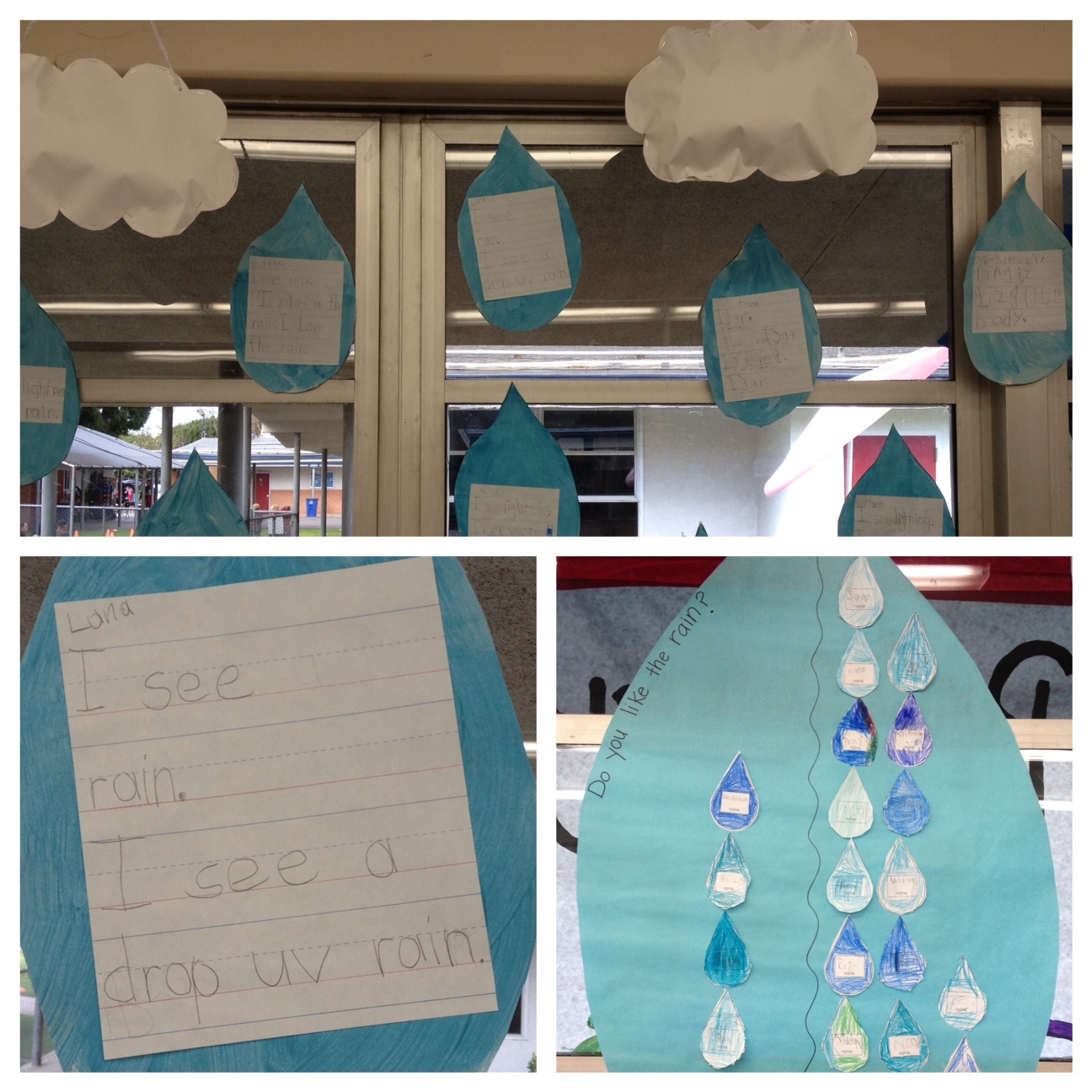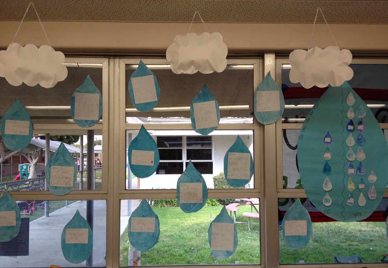 We are learning about all different types of weather, and this week we are focusing on rain. After talking about what we wear in the rain, what we do on rainy days, and what we liked about rainy days, I decided to make large raindrops and write about rain.