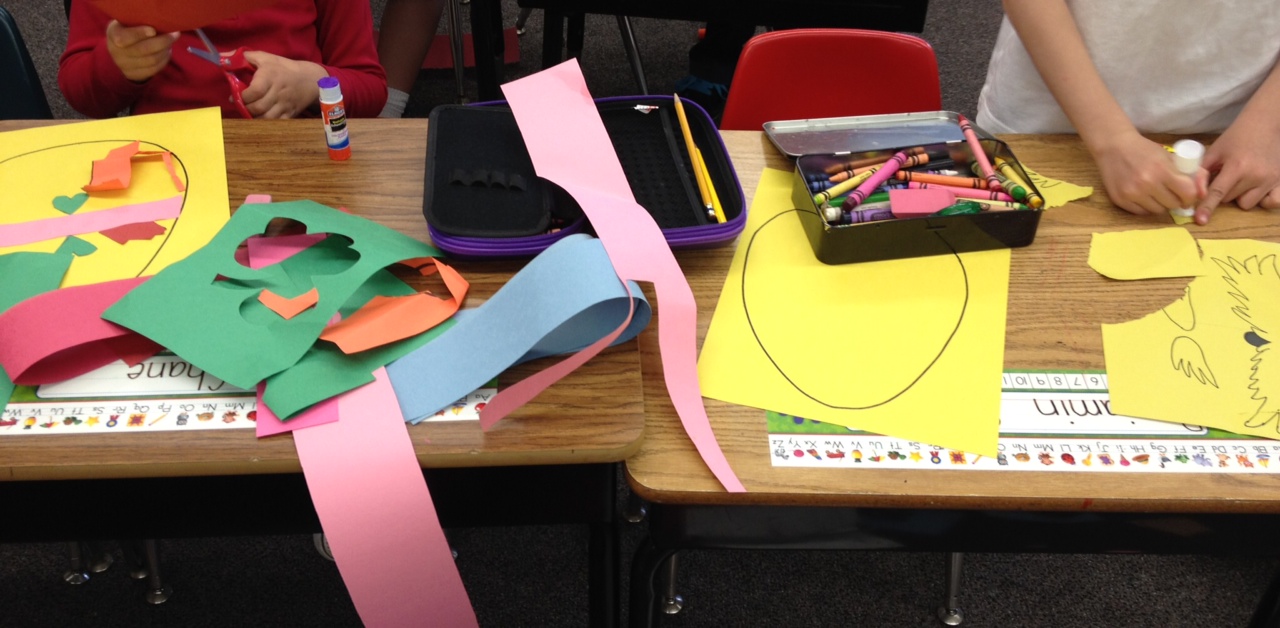 We did this project during “free time,” in which the students can have free play in the room. I called back about 5 kids at a time to work at their desks on the art. It kept them busy and it also reinforced how we can re-use paper for different projects. Normally during free time, I have a bin of paper that are extra copies or scraps, and that is the paper they can draw on. So they were already familiar with recycling paper.