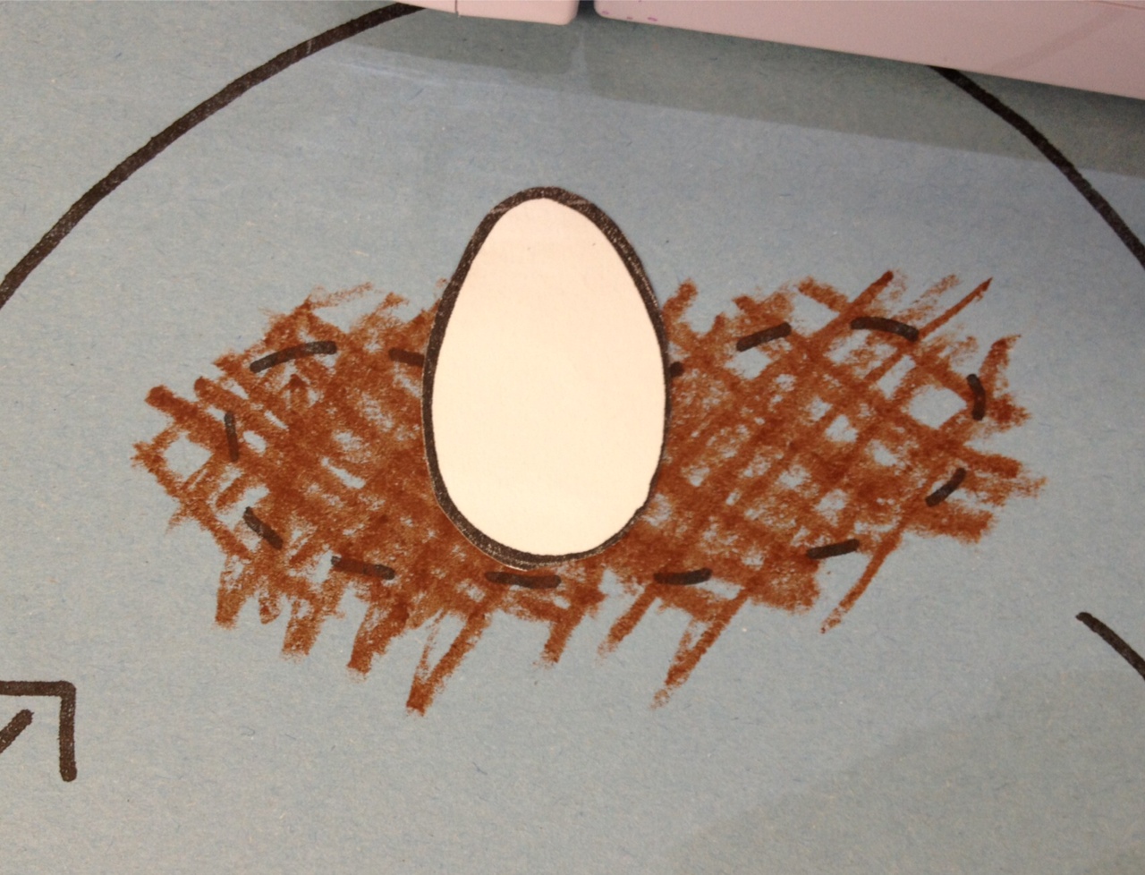 To make the hatching chick, we glued down the egg, then used black crayon to make a “firework” in the center of the egg and cracks coming down. Then we colored the inside yellow and added details to make the little chick’s face showing through. We also added little cracks for the feet to be poking out.