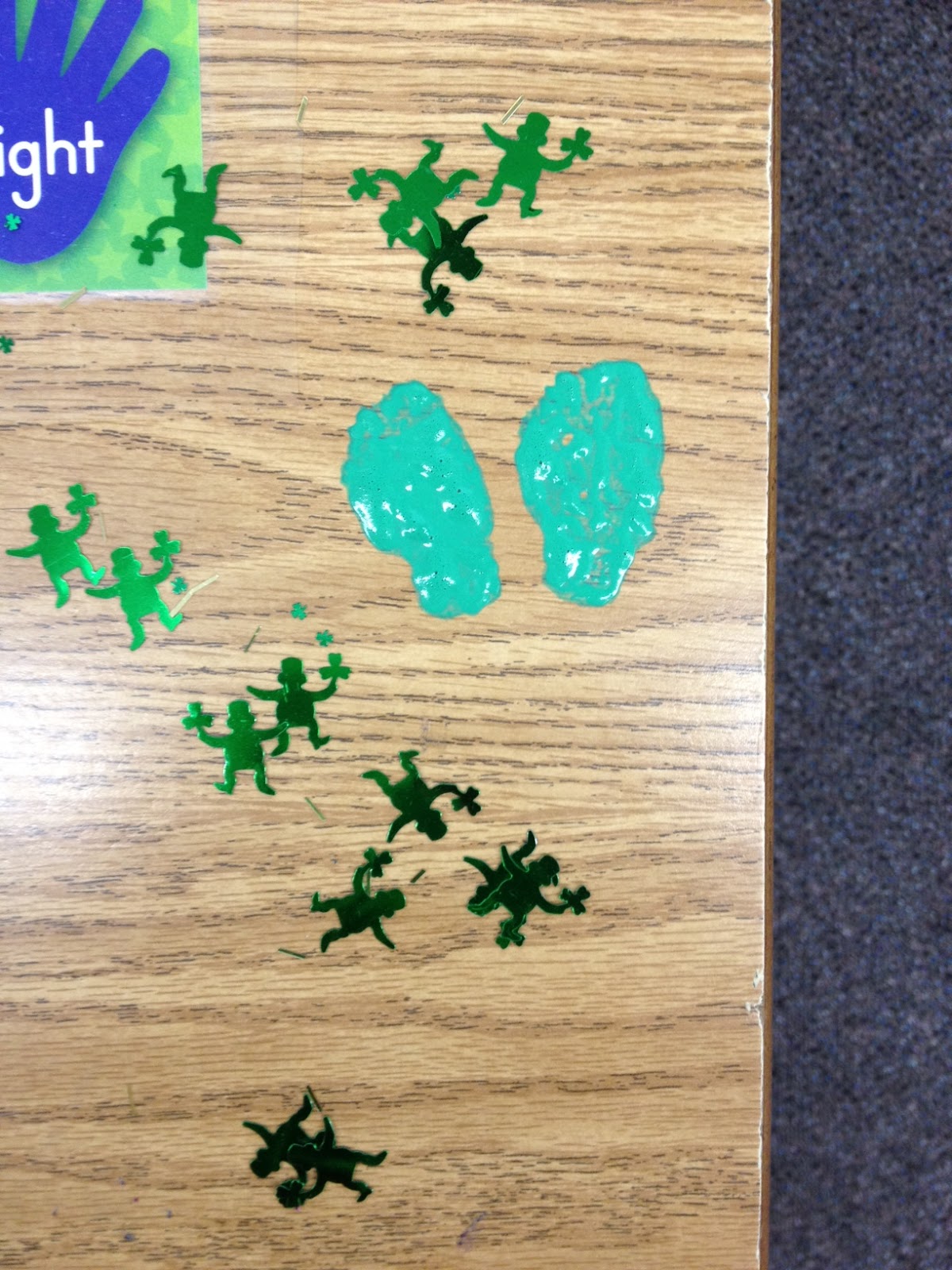 I wanted to show a couple of pics of the leprechaun that visited our classroom yesterday. We made leprechaun footprints using a sponge and green paint (mixed with soap, so it would come off easily) and placed them all over the room while the kids were at recess. This is what they came back to…
