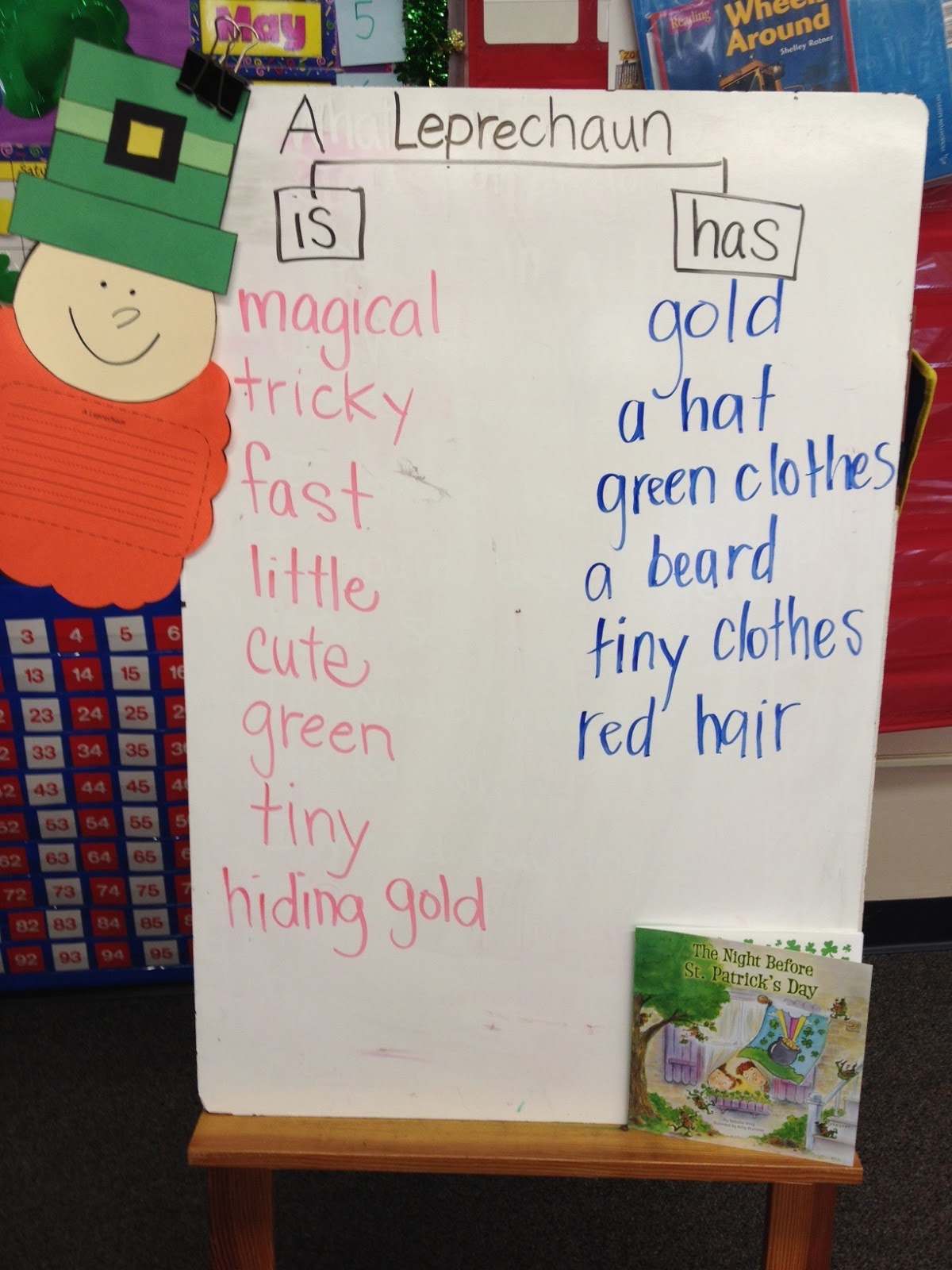 I read a book, The Night Before St. Patrick’s Day, to the students about how sneaky little leprechauns are, and we made a tree map of “A leprechaun, is or has.”