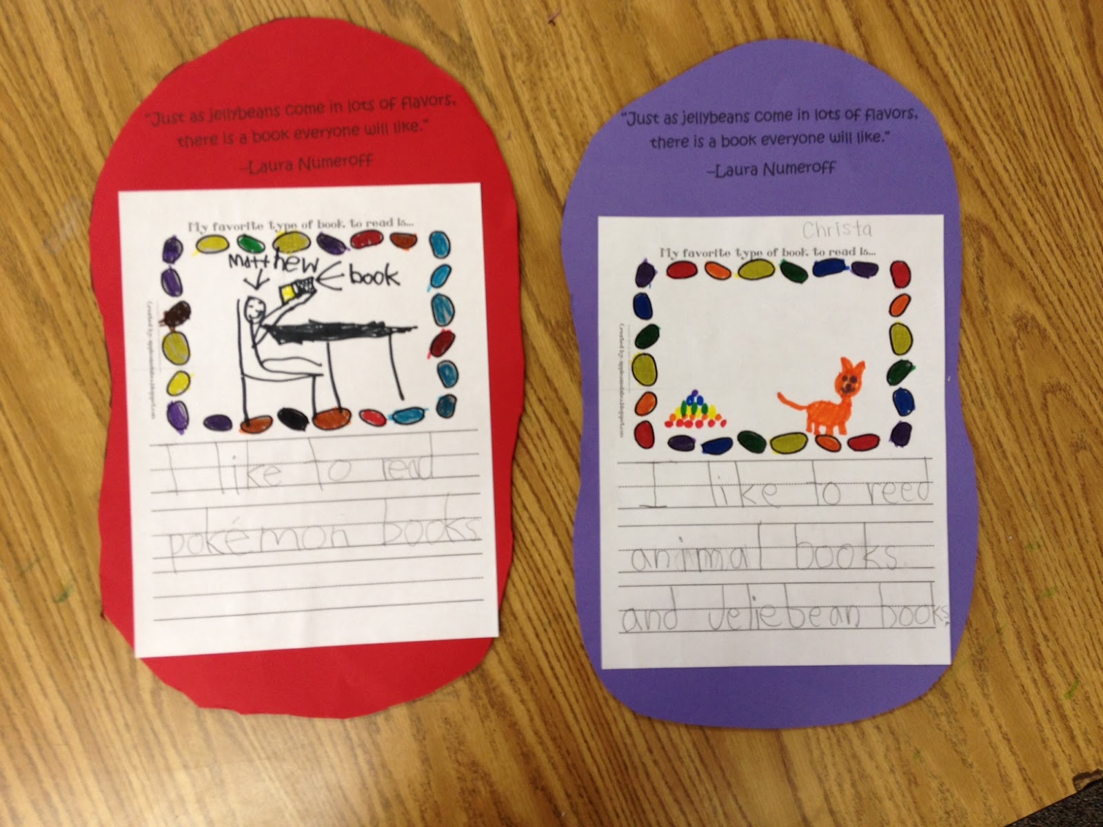 After they wrote a sentence and drew a picture about their favorite type of book, they glued it to a giant jellybean.