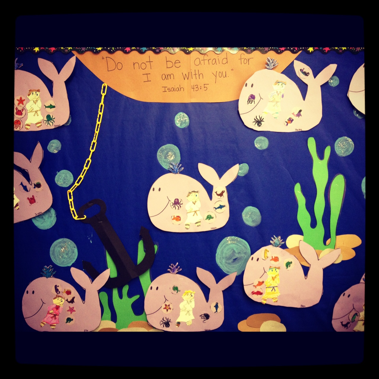 In Bible, we studied the story of Jonah and the Whale (big fish). My aide made an adorable craft to go with our Bible story! She made a whale, with Jonah, and some sea creatures to join him inside the whale. This will be one of my bulletin boards for Open House.
