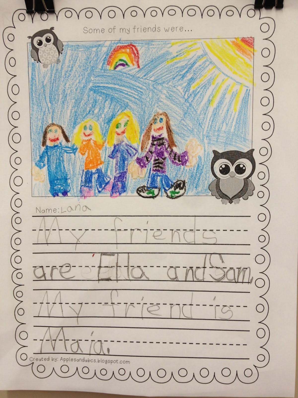 I displayed their journal entries close to the bulletin board. I layered their writing so the parents can flip through their owl journal reflections and see all of them at once. Small binder clips are great for clipping the papers together at the top so you can flip through.