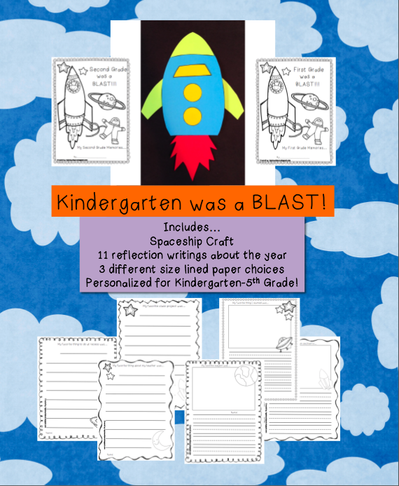 I can’t believe Open House is in a month. That means I need to get my end of the year projects ready and bulletin boards all decorated for when the parents come visit the room. This year, I am going to have my main bulletin board be titled, “Kindergarten was a blast!” The students will make a spaceship craft and write a series of reflection responses about the year. Here is the project if this is something you might want to do with your class!