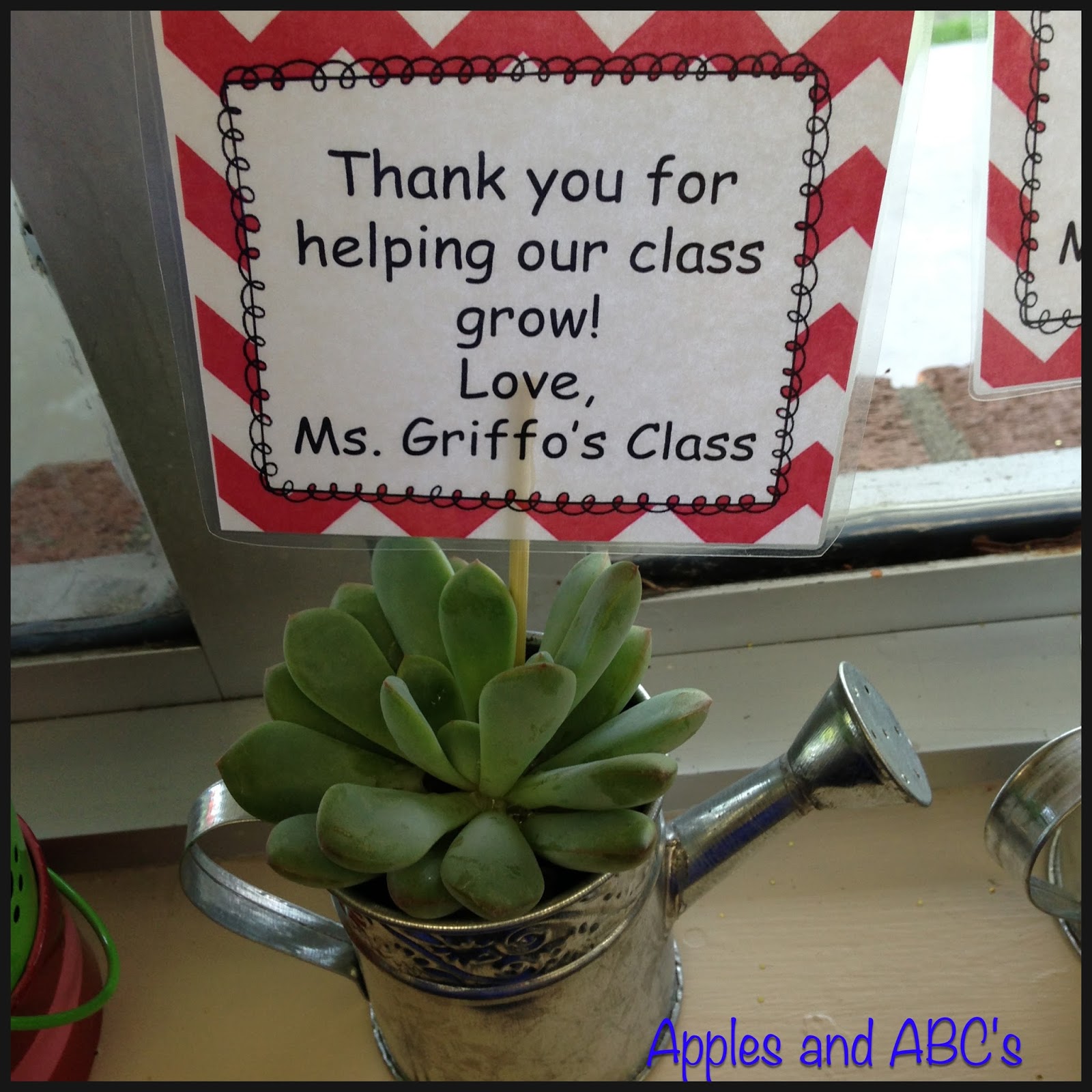 I found tin mini watering cans at Michael’s and they were the perfect thing to hold my little succulents. I made a little sign (after a discussion with my Instagram peers… with Cupcake winning the discussion) to use the phrase, “Thank you for helping our class grow!”