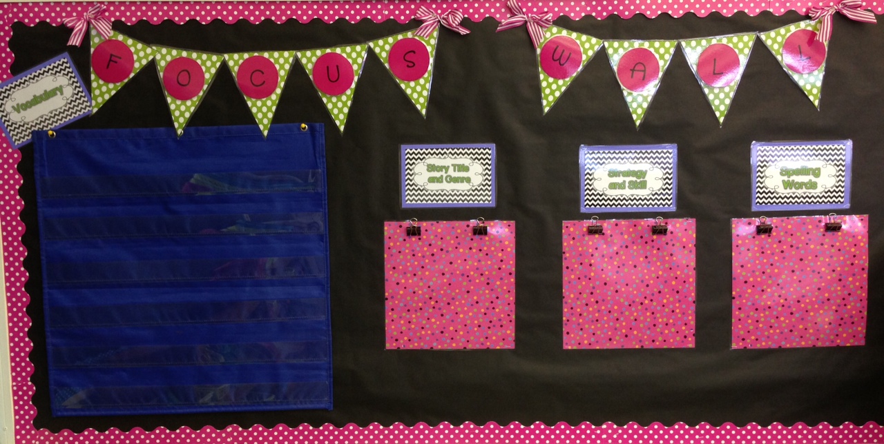 Here is our “focus wall” where we will display the weekly vocabulary and details about the focus story. The pennant flags are available in my TpT Store.