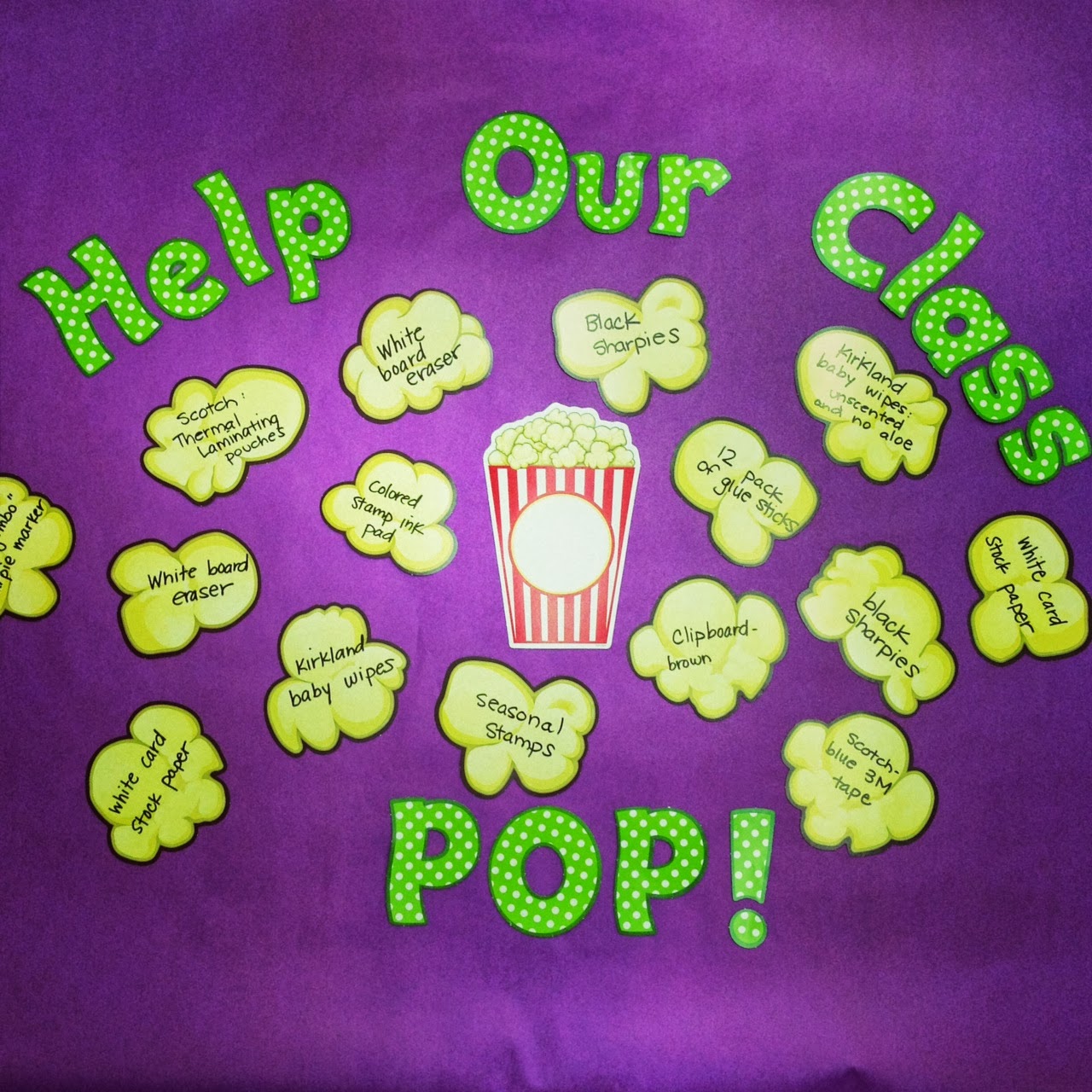 Back to School Night is this week and I wanted to make a cute parent wish list bulletin board. There are some items that I would love to have in my class, and parents are always asking me if there any supplies that I need/want . I made this “Help Our Class Pop” bulletin board to give the parents a chance to donate some goodies to the class.