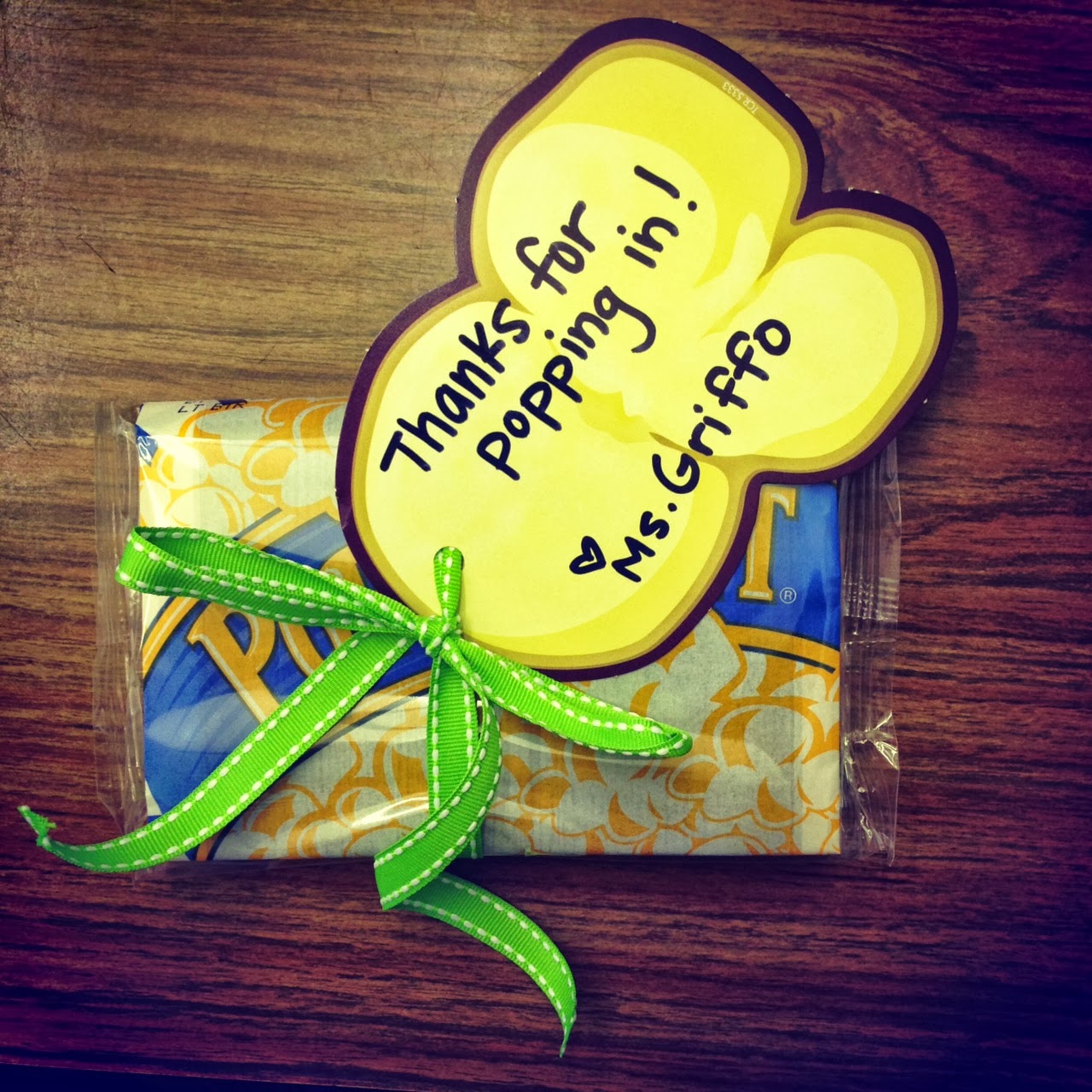 Here is a little popcorn treat that I am going to leave on everyone’s desk. It says, “Thanks for popping in!” and it is attached to a package of popcorn!