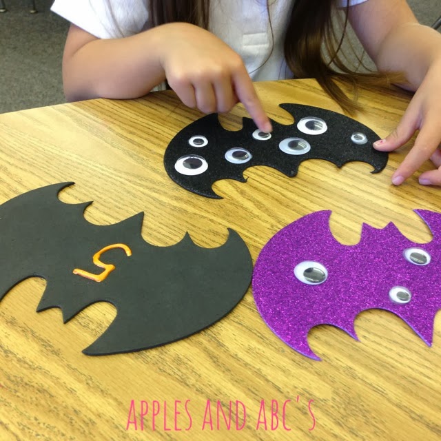 To prep this eyeball counting center, I just glued on googly eyes to the foam bats and puffy painted a matching number for each. It took me about 10 minutes to make a whole counting set.