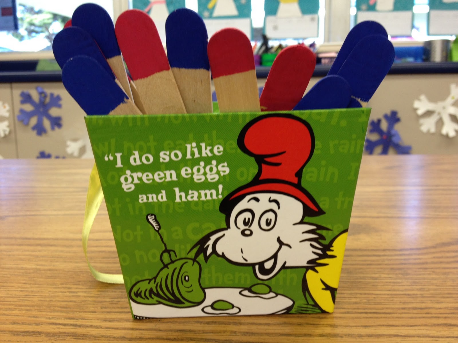 Blue means that those students have not had a turn yet. I pull out one of the blue sticks and read then name. Then I flip it over to the red side when I put it back in the container.