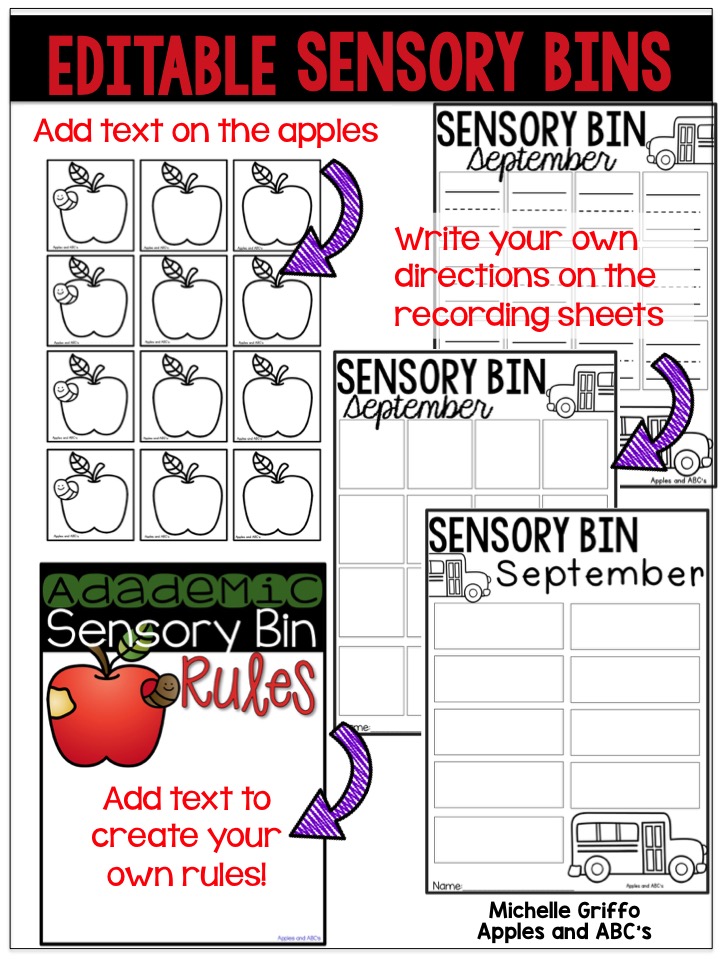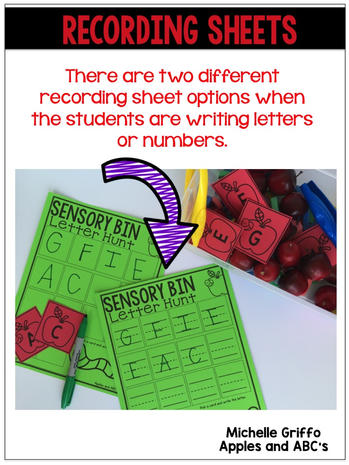 My favorite component of this sensory bin resource is that I made an editable version just for YOU! You can type your own text into the apples, and write your own directions on the recording sheets. I have the printables in PowerPoint and you can type directly on them! I also included a page for you to type your own sensory bin rules! I would use this resource to write the students’ names and have them write them down for practice!