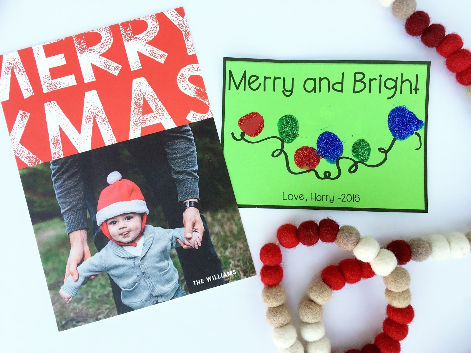 This year, I decided I wanted to send a little craft along with my Christmas cards. I made this printable and stamped my son’s fingers on it to turn it into a string of lights! As he stamped his little finger I kept repeating the color, he loves trying to repeat words, but for now he just catches the first sound in the word.