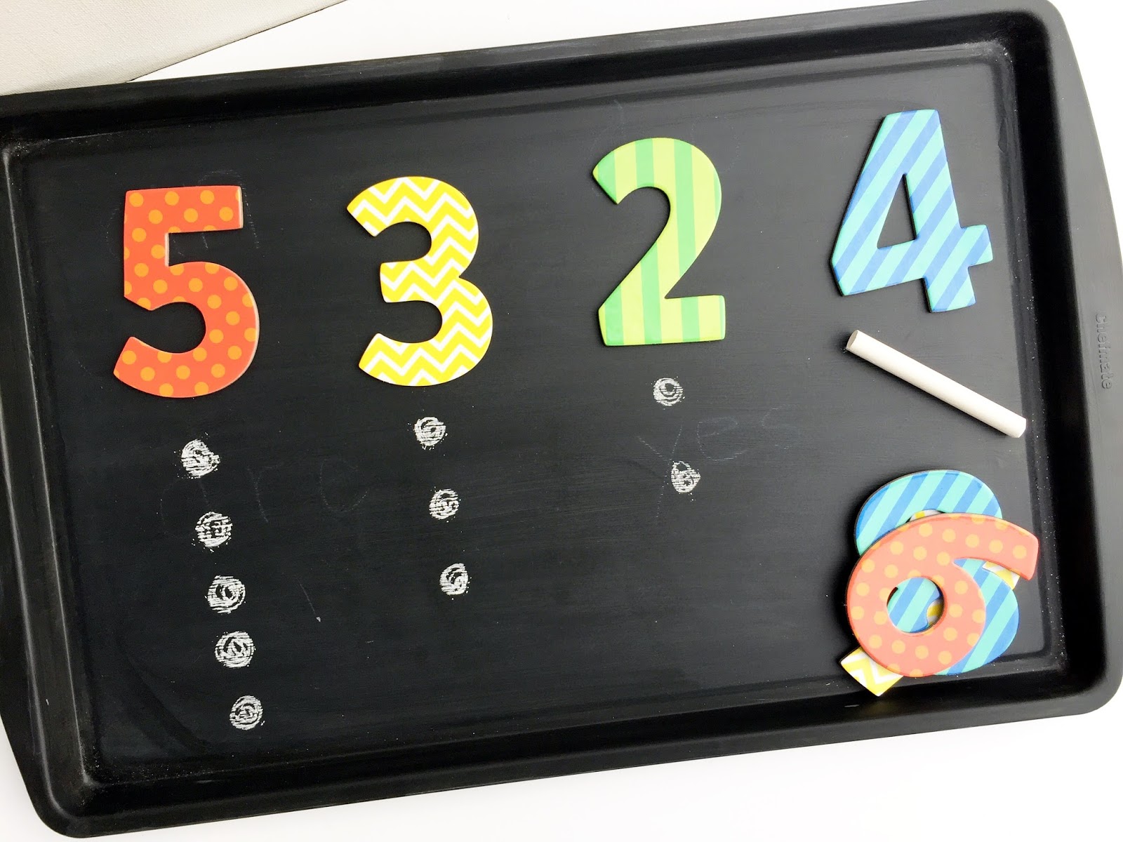 I found a cookie sheet, chalk, magnetic letters, numbers,