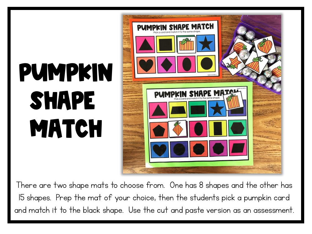 -Pumpkin shape match: students pick a card and match the shape. It includes two mats, one with 8 shapes and the other with 15 shapes for differentiation