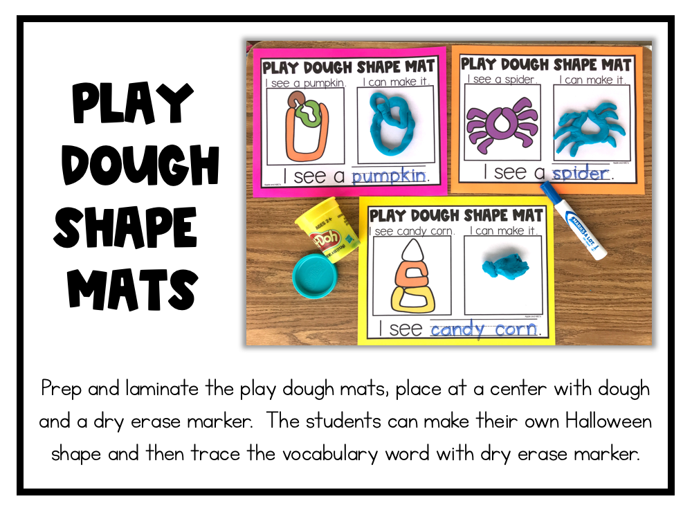 -Halloween play dough mats, includes: hat, spider, pumpkin, candy corn, eyes, ghost, boo, bat. The students copy the shape onto the mat and then trace the vocabulary word.