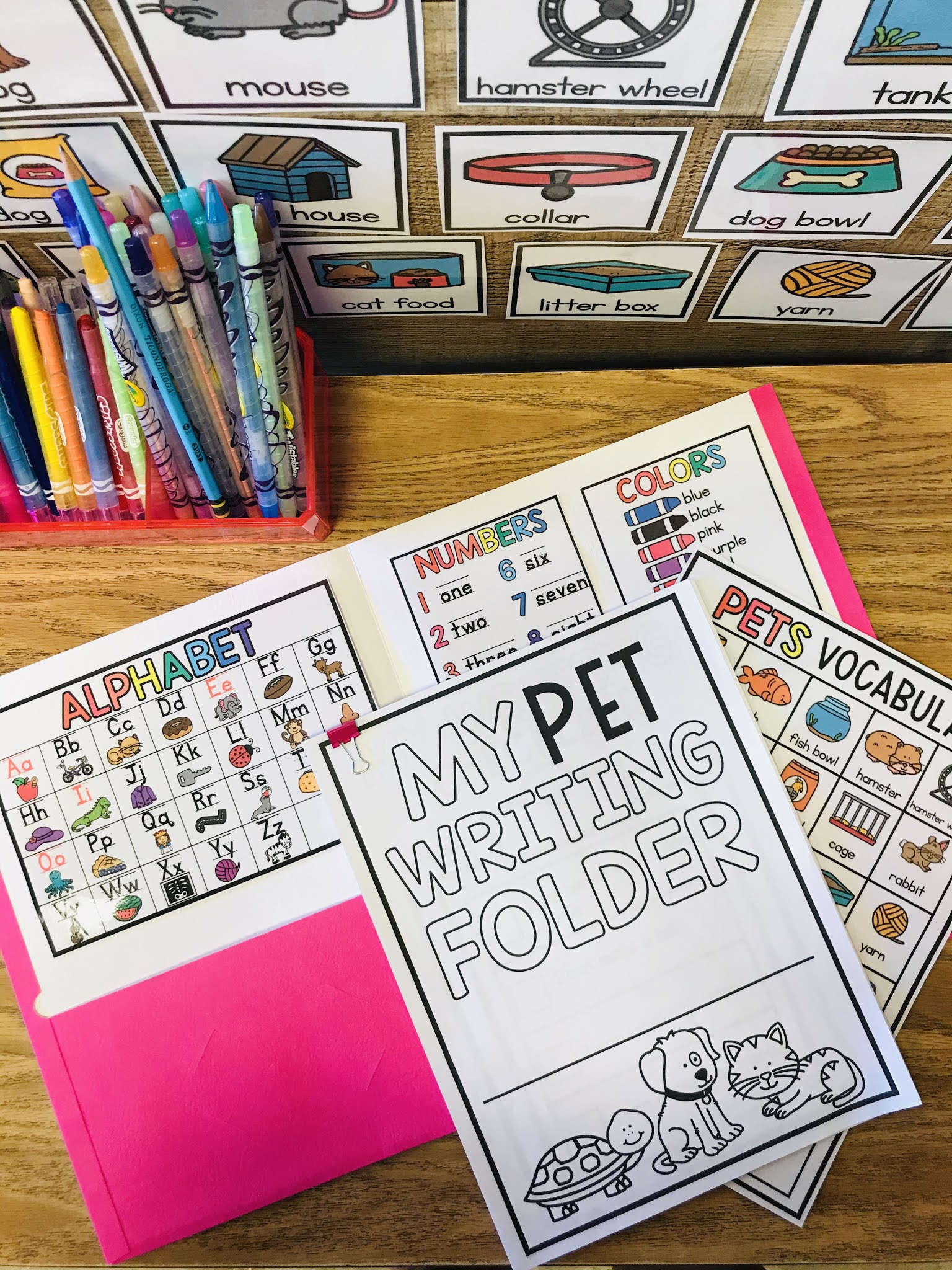 Join my email list for a writing center freebie to see how incredible this resource is! It includes a complete outline of a themed-writing unit on pets. For instance, it includes vocabulary cards, first sound practice, and build the word activities. Additionally, students will work on labeling and writing vocabulary words to practice spelling. Then, they will begin writing with sentence starters before progressing to creating sentences. Honestly, students are going to have so much fun writing!