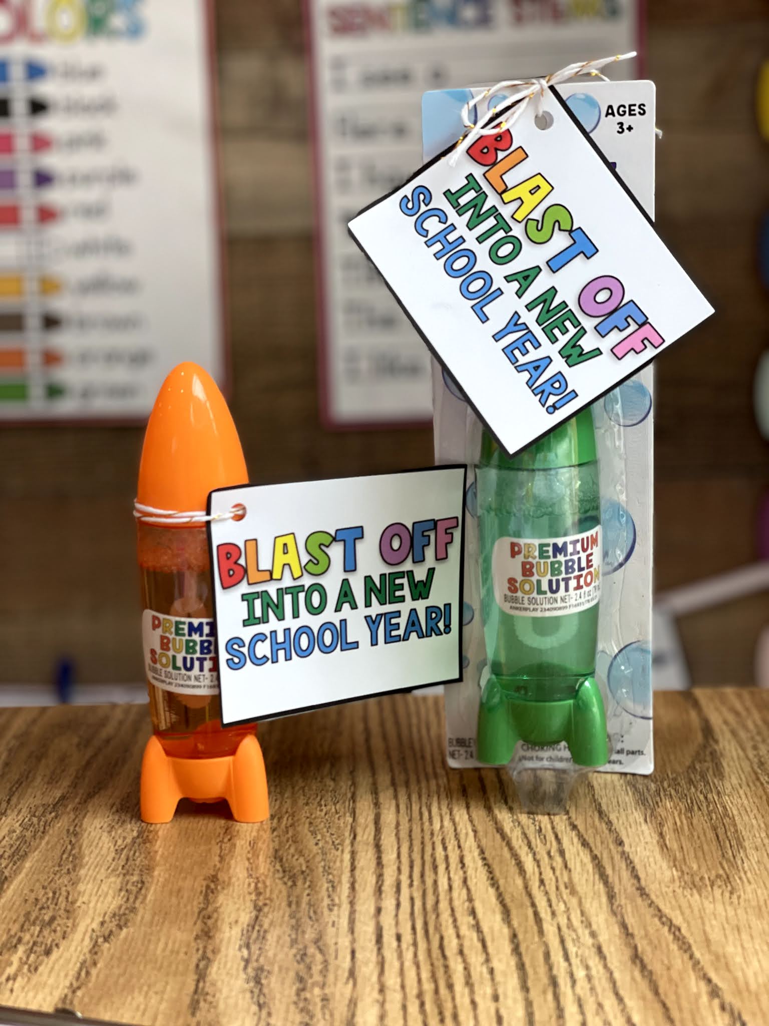 Do you like to have a little welcome gift waiting for your students when they enter your class on the first day of school? I found these rocket bubble wands at Target, and made this FREE bubble gift tag to go with it.